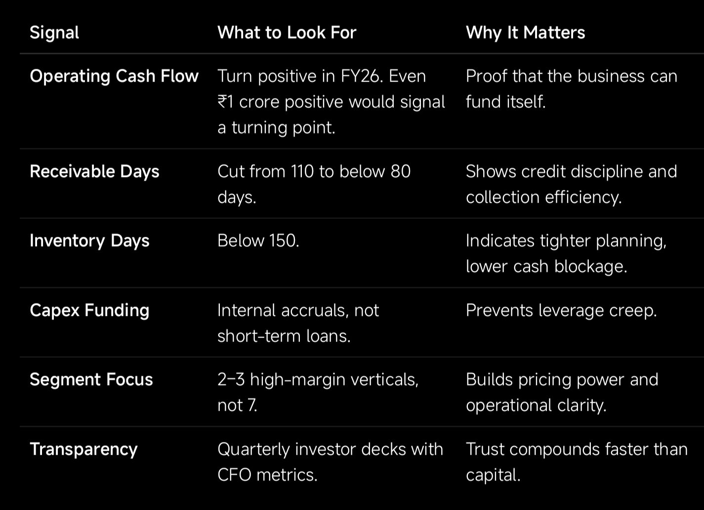 But when every rupee of revenue takes four months to collect, and every finished good sits in inventory longer than the company can afford, the business isn’t compounding — it’s congesting.